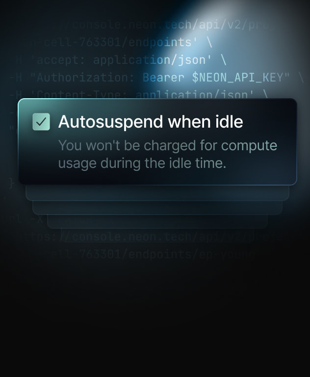 • Powerful API. Use the Neon API to create databases, run migrations, and manage limits.